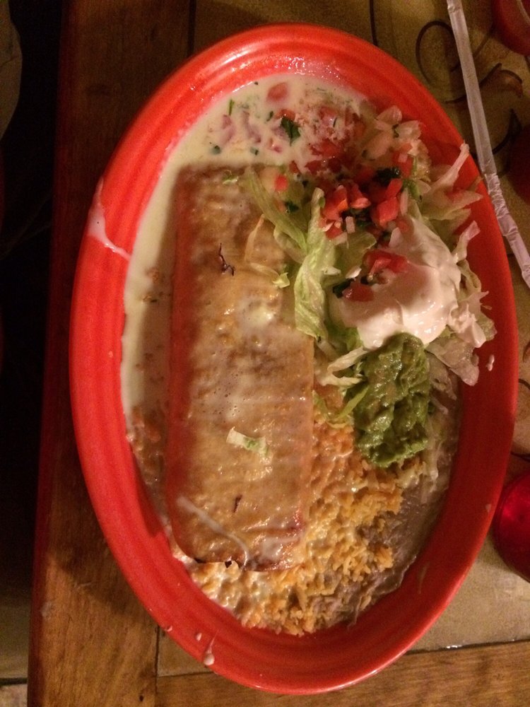 A large burrito filled with ground beef or shredded chicken, topped with burrito salsa and shredded cheese. Served with lettuce, tomato, sour cream, and rice and beans.